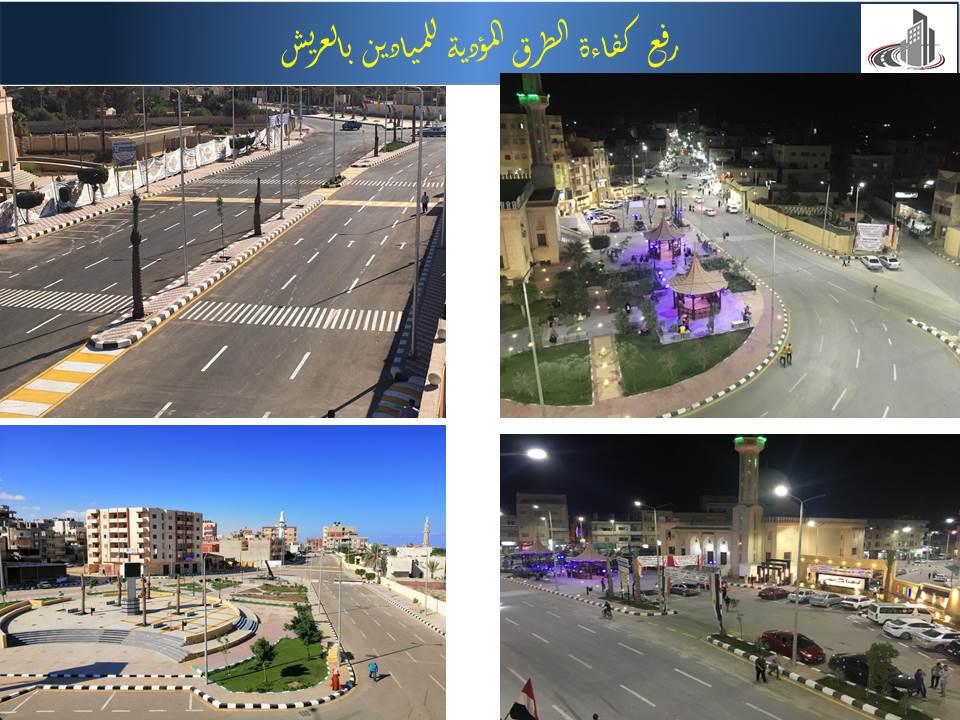 كما تشمل مشروعات الطرق، إنشاء ورصف وإنارة الطريق الرابط بين شارع الفاتح وشارع أسيوط (شارع الخزان) بطول 1,250 كم وعرض 20 مترا، بالعريش، والطريق الرابط بين شارع أسيوط ومنطقة إسكان ابنى بيتك / الجولف "المدرسة التجريبية"، بطول كم وعرض 16 مترا، وإنشاء ورصف ورفع كفاءة شارع المركز الاستكشافي، بطول حوالى كم وعرض 9 أمتار مزدوجة بمدينة العريش، وإنشاء ورصف وإنارة شارع العشريني من شارع الخزان حتي شارع 53 بطول 2.7 كم بمدينة العريش، بجانب مجموعة طرق داخلية ورئيسية بمحافظة جنوب سيناء ضمن خطة الجهاز لتحسين جودة الطرق واستكمالها (رصف طرق داخلية بمدن شرم الشيخ ودهب وسانت كاترين وأبوزنيمة والطور بأطوال حوالي 25 كم - رفع كفاءة طرق الفنار والمعهد الدينى والبنوك بمدينة شرم الشيخ بأطوال حوالي 7 كم - إنشاء طرق بمنطقة الجبيل وحى الأمل بمدينة الطور بطول 5 كم - توسعة وتطوير طريق السلام بمدينة شرم الشيخ بطول 5 كم - إنشاء ورصف المرحلتين الثانية والثالثة بمدينة دهب بأطوال 31 كم - ازدواج مدخل مدينة طور سيناء من اتجاه كمين الوادي بطول 3,5 كم - إنشاء ورفع كفاءة الطرق الداخلية بمدينة دهب (المرحلة الرابعة) بطول 4 كم)، و9 مشروعات بجنوب سيناء بتمويل من المحافظة (رصف طرق داخلية بمدينة الطور - إنشاء ورصف طرق بطول 3,5 كم بمدينة أبوزنيمة - إنشاء ورصف طرق بطول 7,5 كم بمدينة دهب - إنشاء ورصف طرق بطول 14,5 كم بمدن شرم الشيخ وسانت كاترين - إنشاء ورصف الطرق الداخلية بمدينة شرم الشيخ - رفع كفاءة وصيانة الطرق بنبق بمدينة شرم الشيخ - إنشاء ورصف طرق داخلية بمدينة طور سيناء - رصف طرق داخلية بمدينة شرم الشيخ بطول 6 كم- إنشاء ورصف طرق داخلية بمدينة الطور بطول 4 كم).