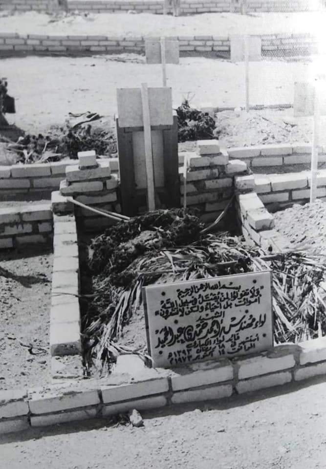 قبل آخر ضوء بقليل توجهت إلى الكوبرى لاعرف موعد تشغيله وخلال تحركى بالعربة الجيب على المدق شاهدت جنديين من المهندسين يتحركان فتوقفت لأسألهم عن موقف إصلاح الكوبرى، وعلمت منهم أن خالى استشهد، وكان هو الوحيد الذى أصيب فأسرعت إلى الكوبرى ووجدت وجوما على وجوه جميع الضباط والجنود العاملين على الكوبرى، حزنا على قائدهم الشجاع، وحضر لى قائد كتيبة الكبارى ظنا منه أننى لا أعرف باستشهاد خالى، وأخبرته بأننى علمت وقال لي إنه فور استشهاده تم نقل جثمانه ولفه فى بطانية ميرى ووضع يمين المدق خلف الساتر الترابى الذي (أقيم مكانه فيما بعد نصب تذكارى صغير) ثم بانتهاء الإصلاح تم نقله إلى مقابر الشهداء المؤقتة التابعة لمحطة السويس العسكرية، حيث تم دفنه بالأسلوب المتبع لدفن الشهداء فيوضع كما هو بملابسه التى استشهد بها ملفوفا بالبطانية فى لحد، ويغطى اللحد بلوح من الصاج المجلفن المعرج ثم يغطى بالرمل، ويحدد بشكاير الرمل ويوضع لافتة عند الراس بها رقم القبر واسم الشهيد ورتبته وتاريخ الاستشهاد، ونفس هذه البيانات تكتب على ورقة وتطوى وتوضع فى زجاجة مقفولة بإحكام.. توضع عند قدم الشهيد.