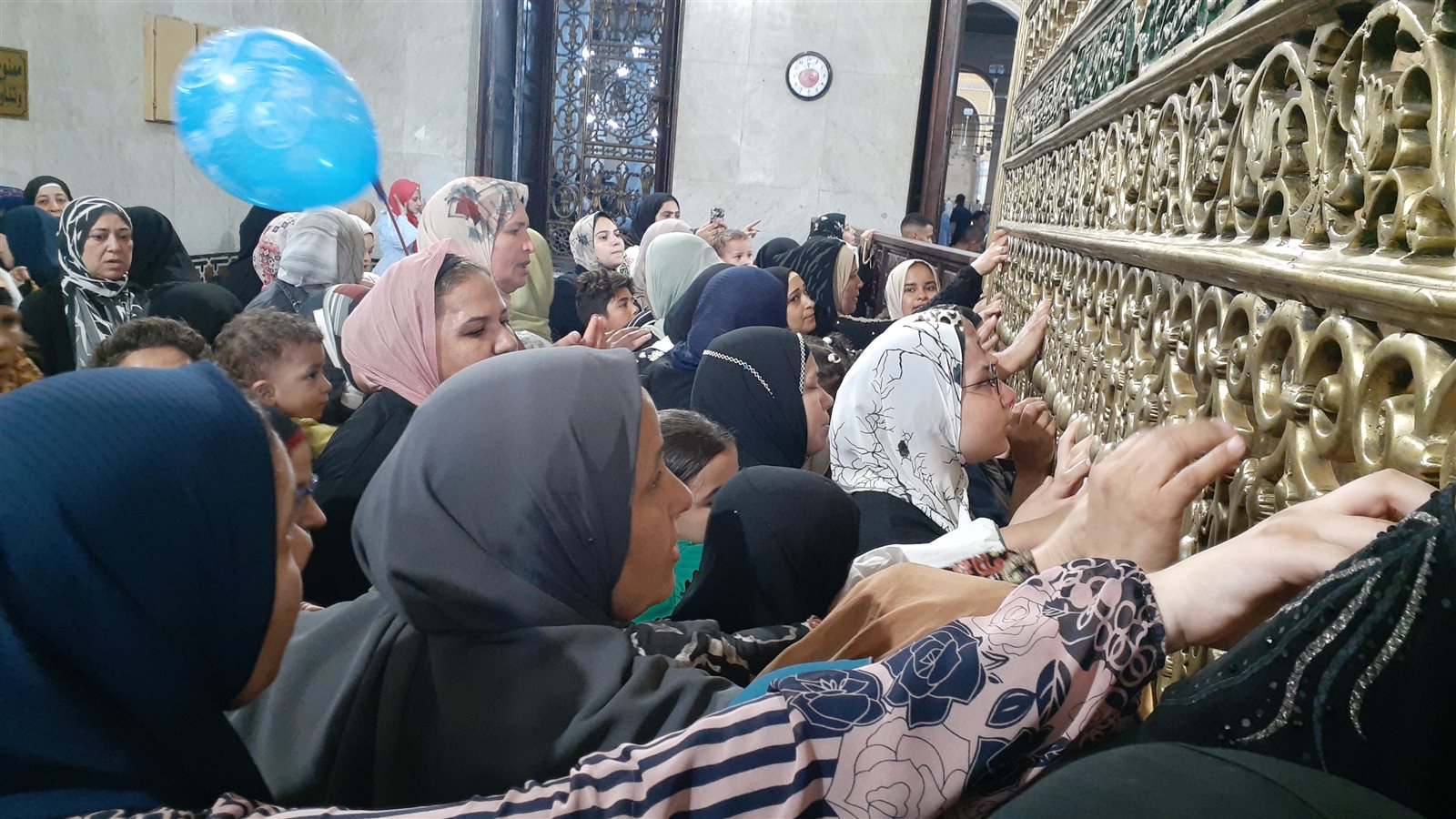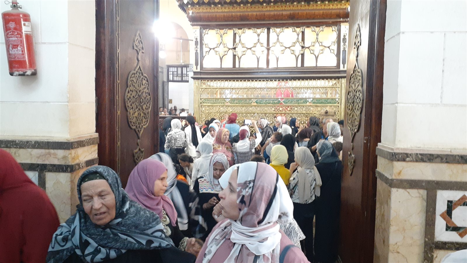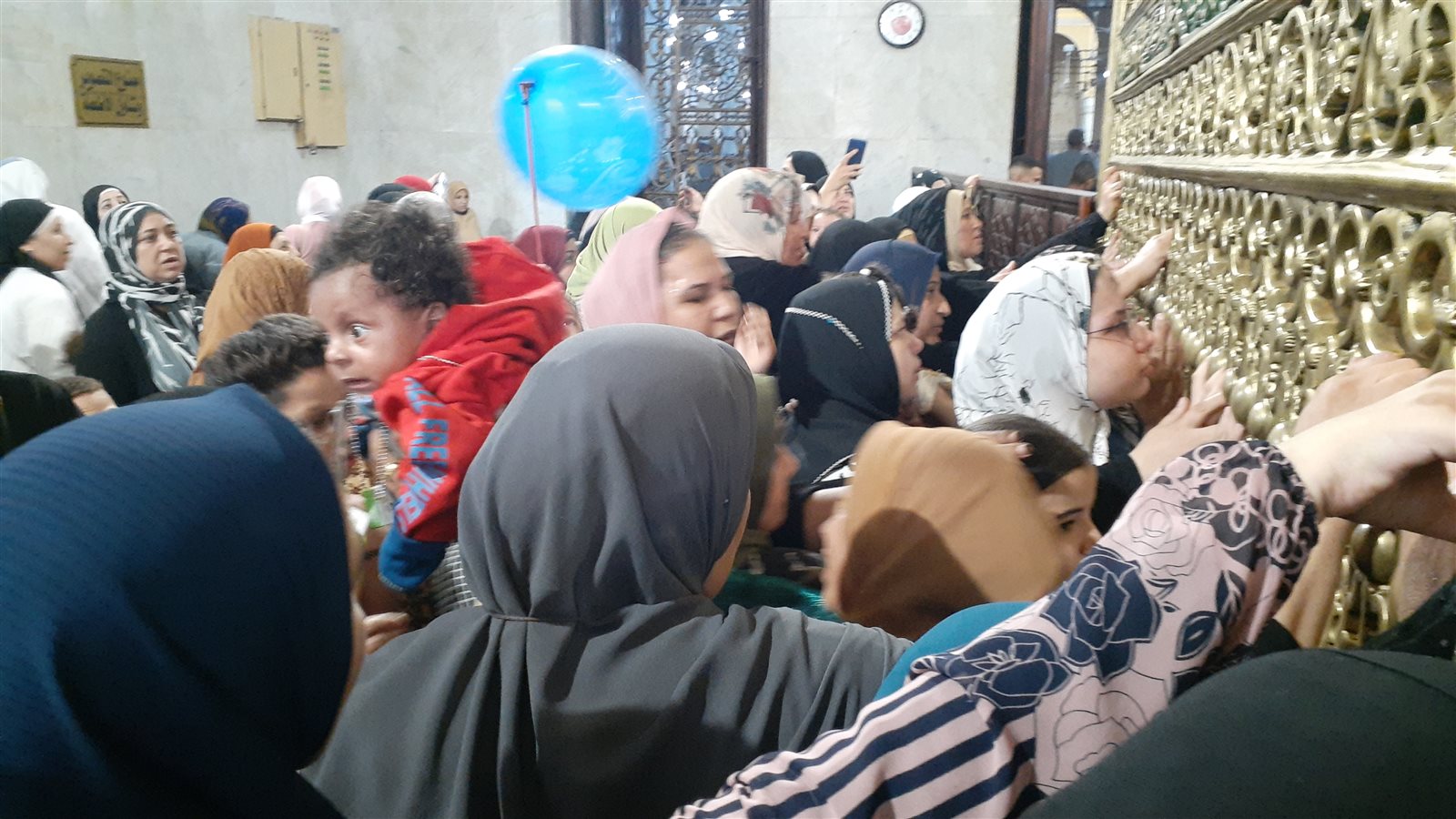 على الباب في الخارج وقفت عدة سيدات عجزن عن الدخول للمقام بسبب التكدس والازدحام، فاكتفين بالوقوف على الجانب الآخر داخل المسجد في الجهة المقابلة للمقام، منهن من توزع الطعام، وأخرى تنظر إلى المقام وتلقي التحية، وثالثة تلوح بأيديها وكأنها ترحب بزوار المقام.