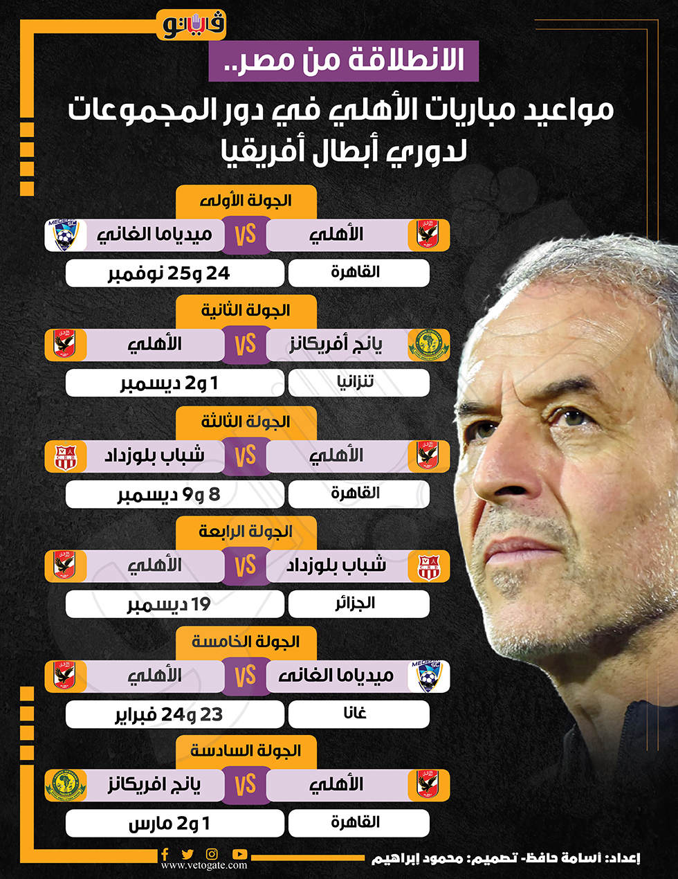 الانطلاقة من مصر.. مواعيد مباريات الأهلي في دور المجموعات لدوري أبطال أفريقيا (إنفوجراف) السبت 07/أكتوبر/2023 - 01:38 م 10/7/2023 1:38:13 PM مباريات الأهلي في ابطال افريقيا، فيتو اسامة حافظ شارك طباعة 18 حجم الخط شارك طباعة مواعيد مباريات الاهلي مباريات الاهلي دوري أبطال أفريقيا دور المجموعات لدوري أبطال أفريقيا شباب بلوزداد مواعيد مباريات دوري ابطال
