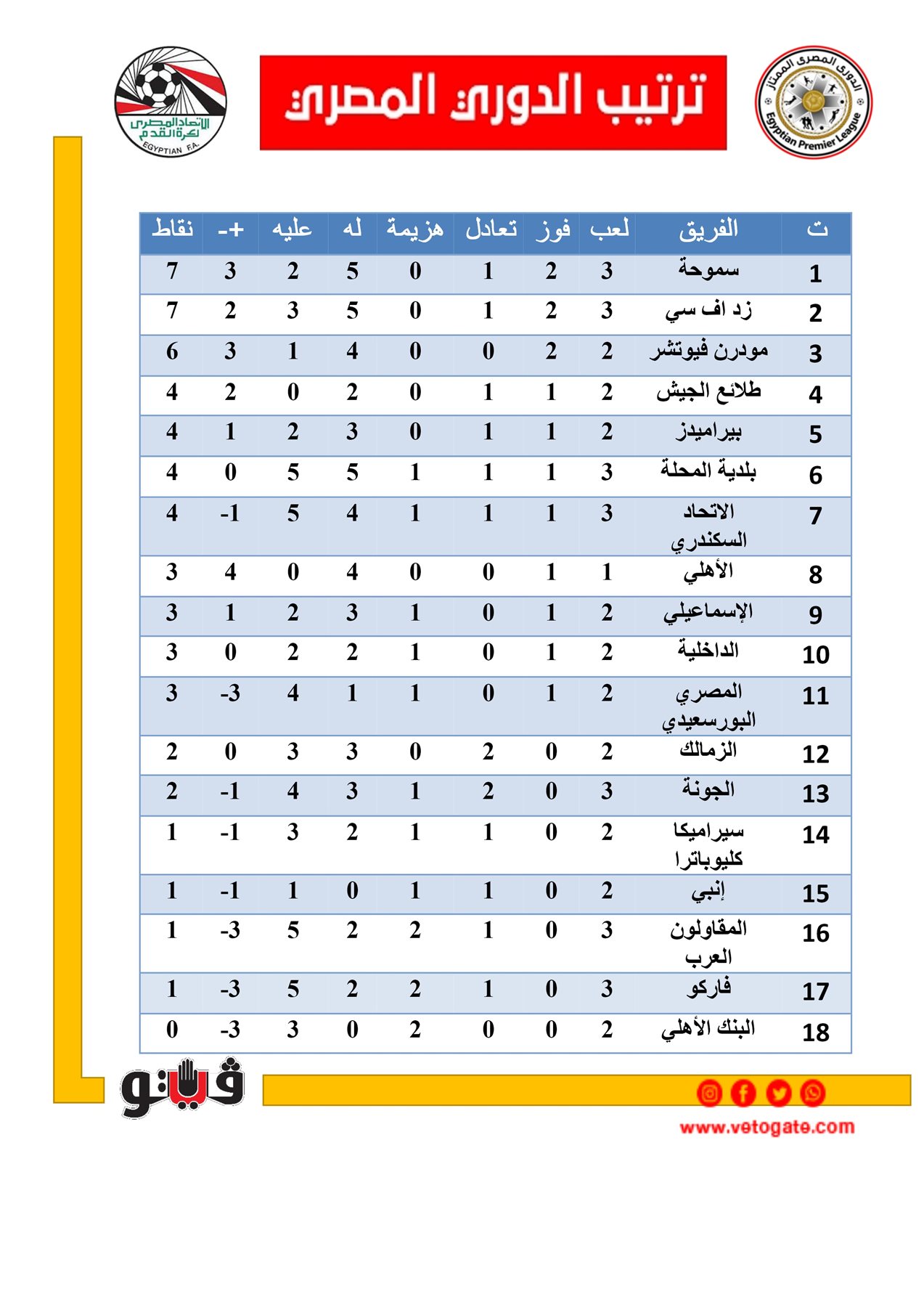 ويتصدر سموحة قمة جدول ترتيب الدوري المصري الممتاز بفارق الأهداف عن زد قبل مباريات اليوم السبت في الجولة الثالثة لبطولة الدوري.