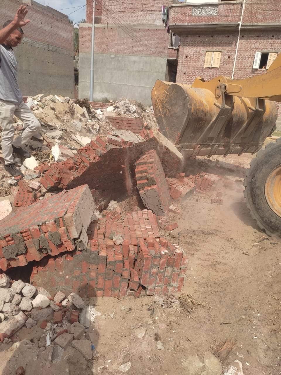 كما تم إزالة حالتي تعدي بمساحة 200 م2 عباة عن مباني بالطوب الأحمر وشدات خشبية برشيد، وحالتي تعدي بمساحة 200 م2 عبارة عن أسوار ومباني بالطوب الأبيض والأسمنت خارج الحيز العمراني بنطاق قريتي صفط الحرية والنبيرة باتياي البارود.