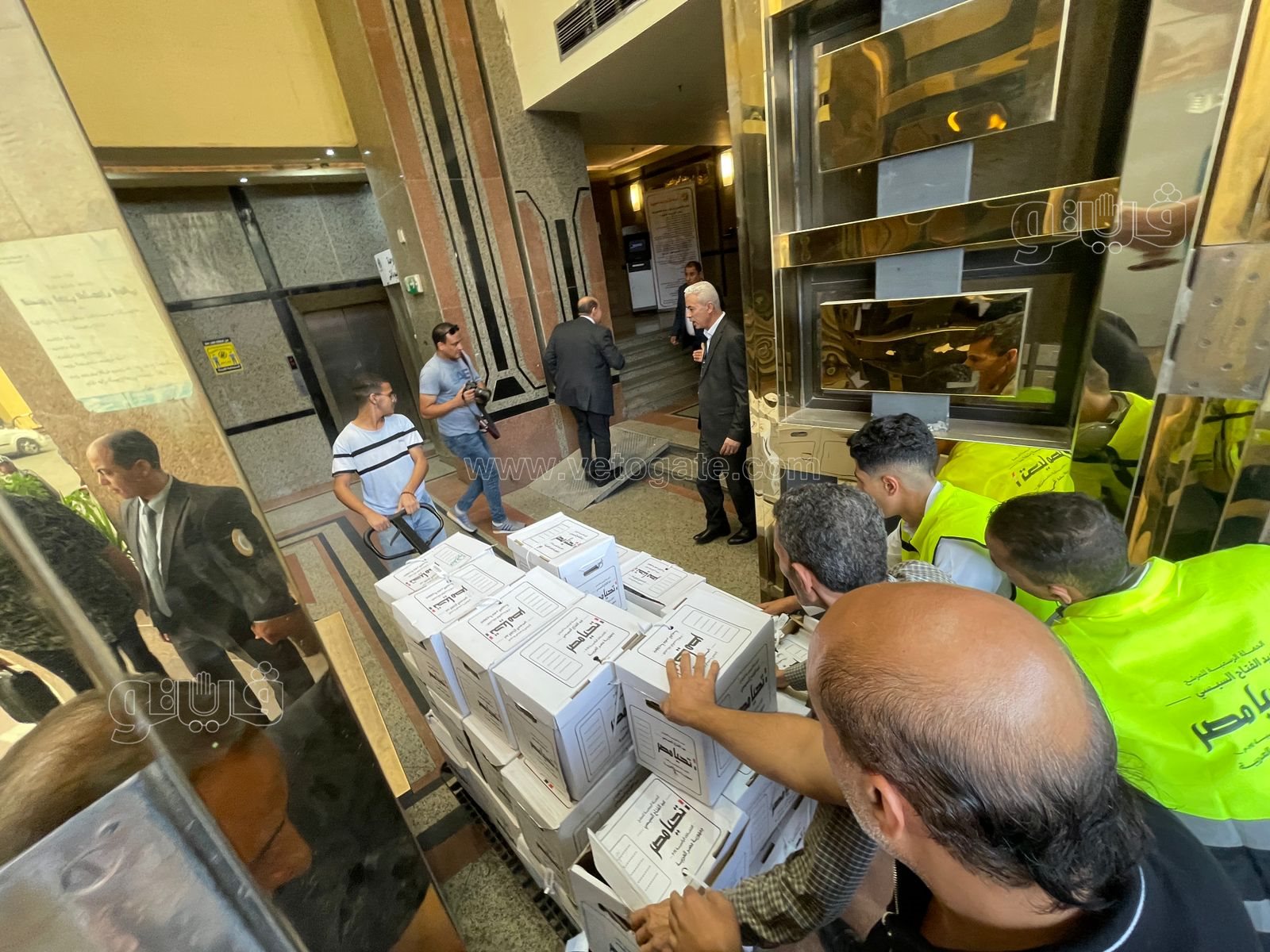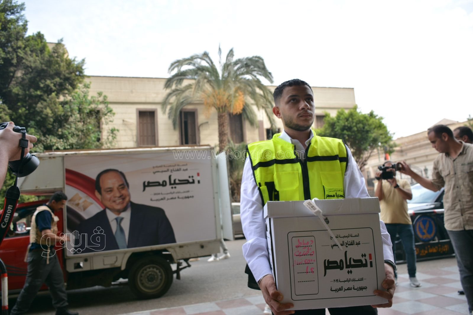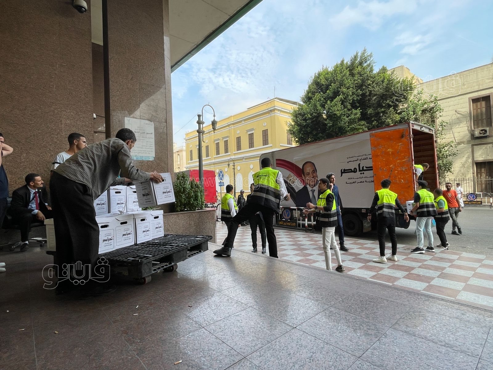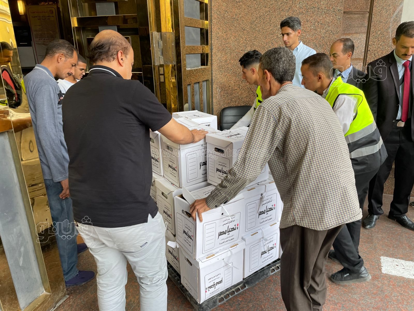 وصاحب التوكيلات عدد من الشباب والفتيات الذين يرتدون قمصان تحمل اسم تحيا مصر، حيث قاموا بنقل الصناديق إلى الهيئة الوطنية للانتخابات.