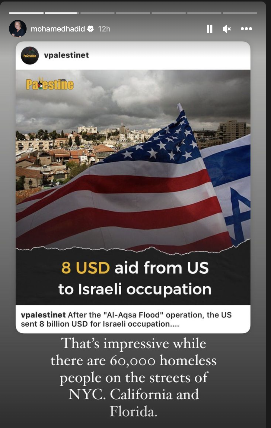 فيما انتقد رجل الأعمال الشهير، ووالد كلا من جيجي وبيلا حديد، اللاتي يعتبرن من أهم عارضات الأزياء في العالم، المساعدات المالية الضخمة التي تقدمها أمريكا لإسرائيل، في حين أن هناك الآلاف المحتاجين والمشردين من الشعب الأمريكي.