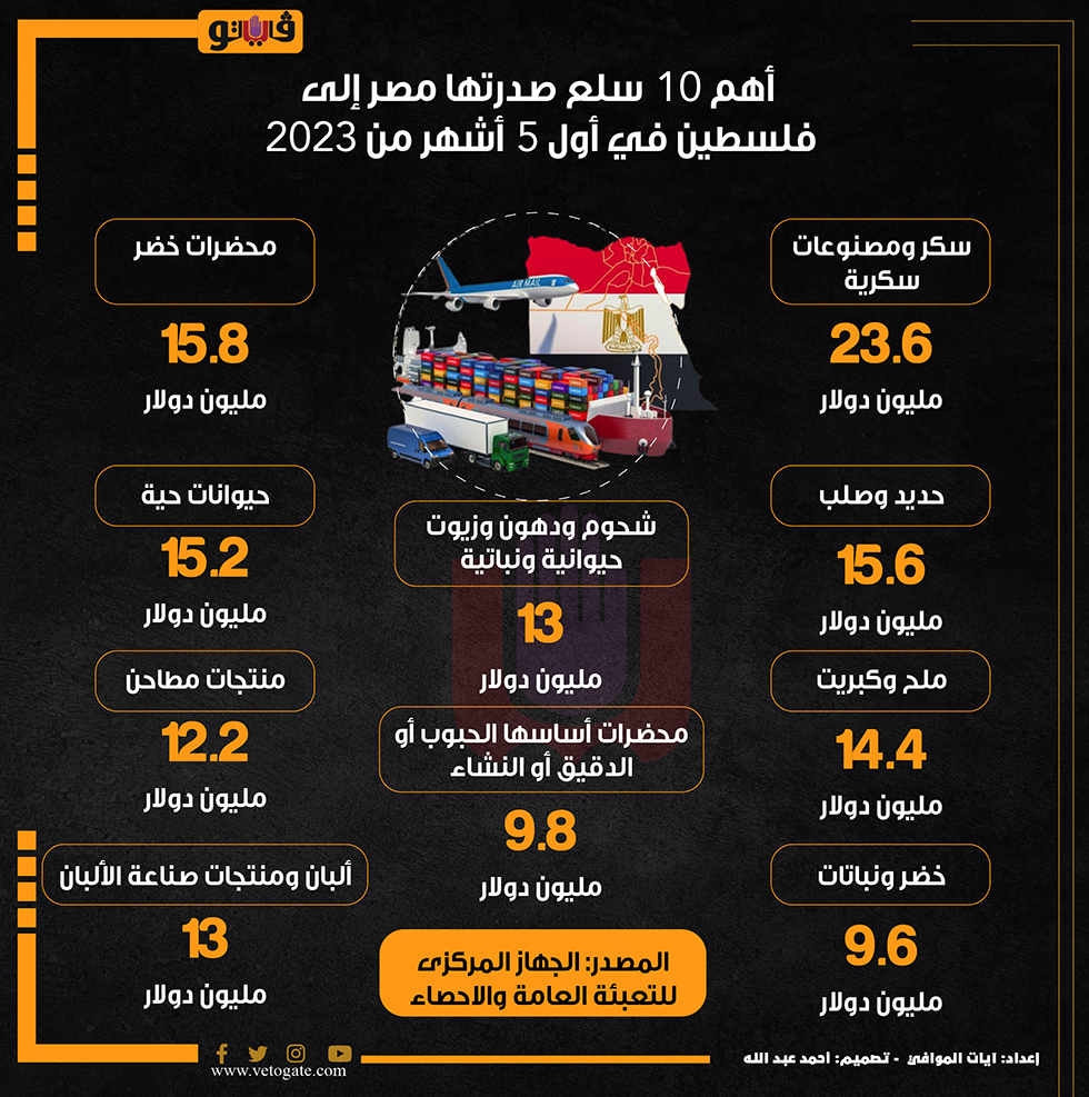 أهم 10 سلع صدرتها مصر إلى فلسطين في أول 5 أشهر من 2023 (انفوجراف) الأحد 08/أكتوبر/2023 - 08:42 م 10/8/2023 8:42:09 PM سلع صدرتها مصر إلى فلسطين، فيتو آيات الموافى شارك طباعة 18 حجم الخط شارك طباعة سكر محضرات حديد