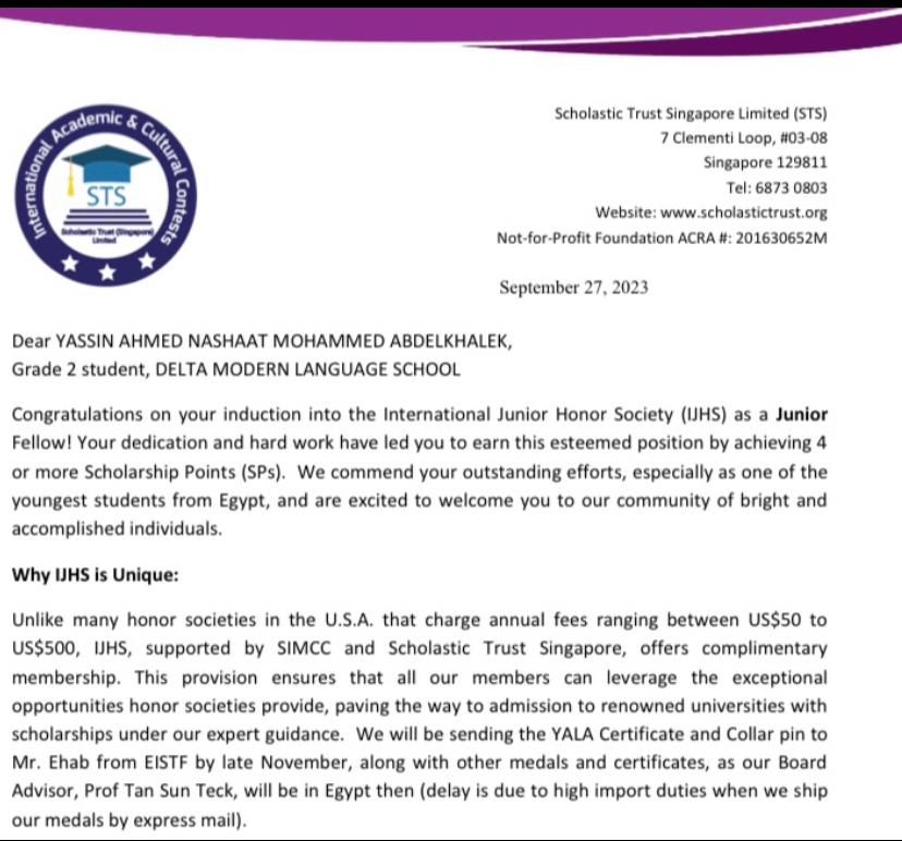 أصغر طالب بمصر يحصل على عضوية قائمة الشرف الدولية بسنغافورة