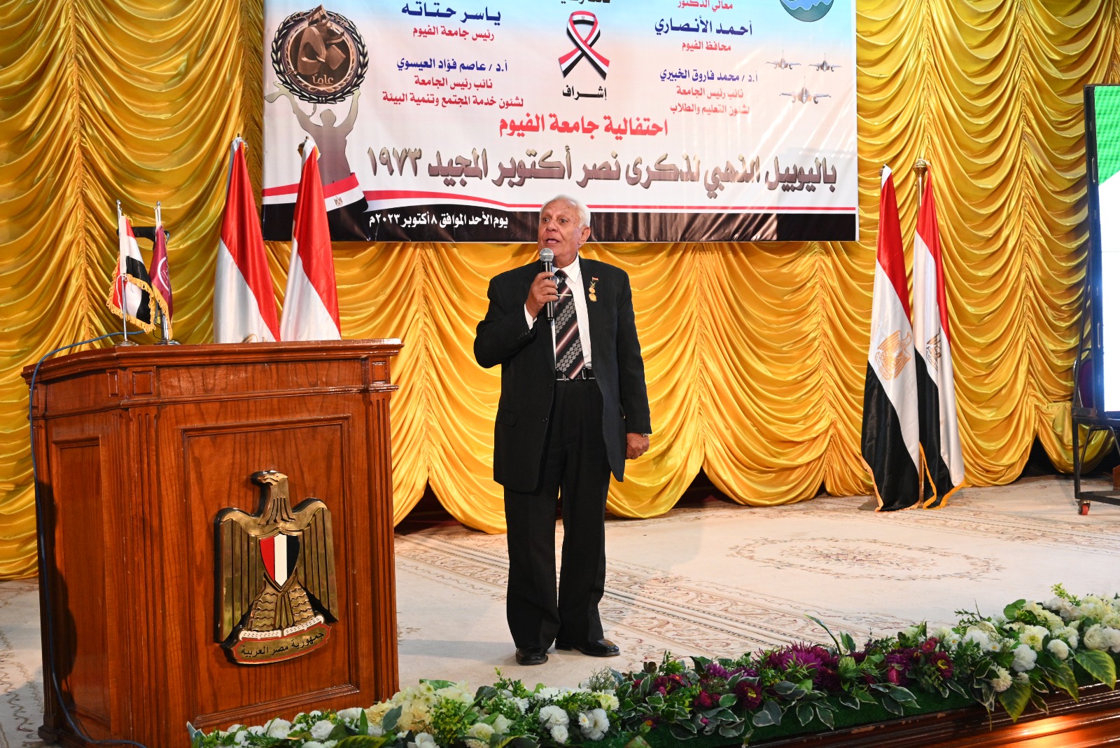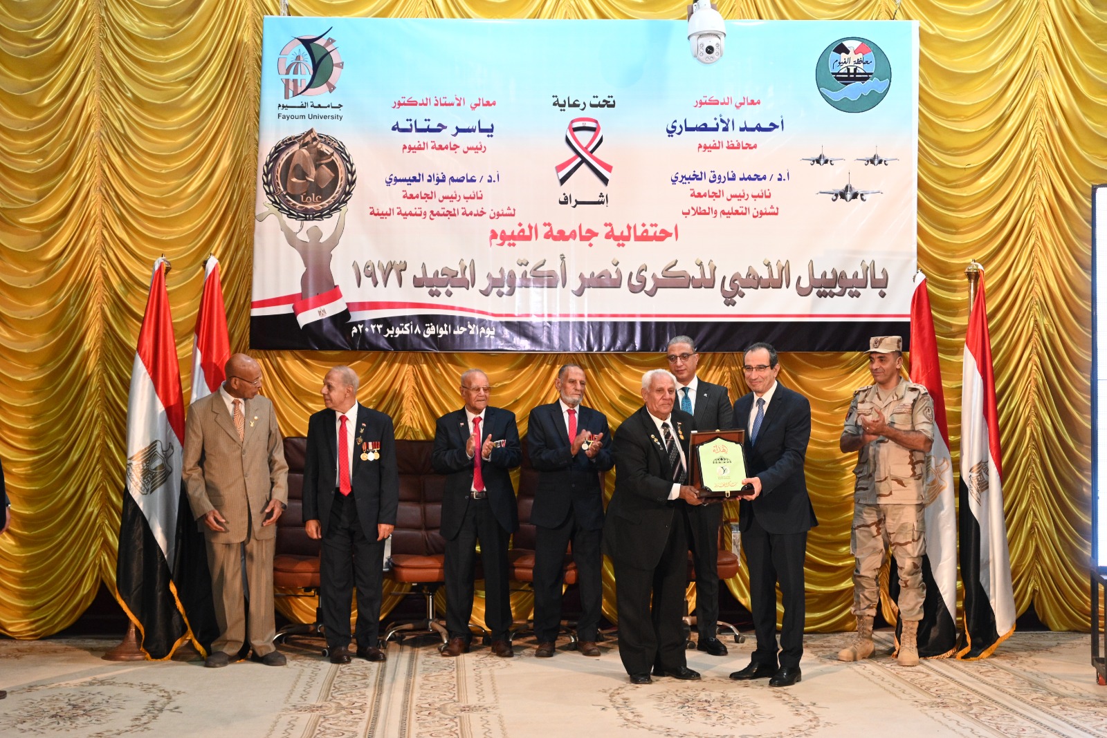 شهد الدكتور أحمد الأنصاري محافظ الفيوم، والدكتور ياسر مجدي حتاتة رئيس جامعة الفيوم احتفالية "اليوبيل الذهبي لذكرى حرب أكتوبر المجيدة ١٩٧٣" التي نظمها قطاع خدمة المجتمع وتنمية البيئة بالتعاون مع قطاع شئون التعليم والطلاب، اليوم الأحد، بقاعة الاحتفالات الكبرى بالجامعة، استضافت الجامعة عددًا من أبطال حرب أكتوبر، ليرووا بطولاتهم أثناء الحرب.
