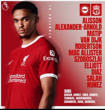 و كشف الألماني يورجن كلوب المدير الفني لفريق ليفربول تشكيل فريقه بقيادة النجم المصري محمد صلاح،في مباراة نظيره برايتون ضمن منافسات بطولة الدوري الإنجليزي الممتاز.