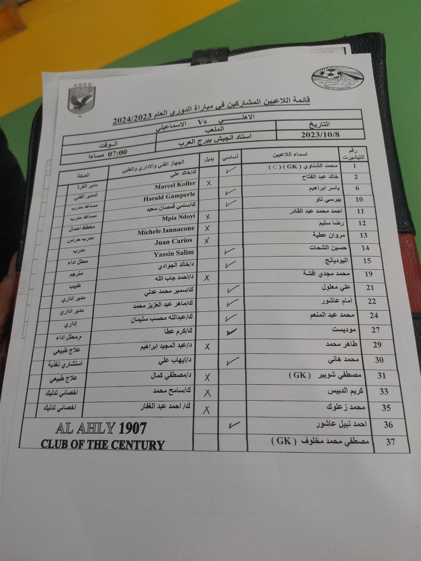 وأعلن السويسري مارسيل كولر المدير الفني للنادي الأهلي عن تشكيل فريقه استعدادا لمواجهة الإسماعيلي في المباراة المقرر إقامتها مساء اليوم الأحد على ملعب برج العرب بالإسكندرية ضمن منافسات الجولة الثالثة من بطولة الدوري المصري الممتاز للموسم الحالي 2023-2024.