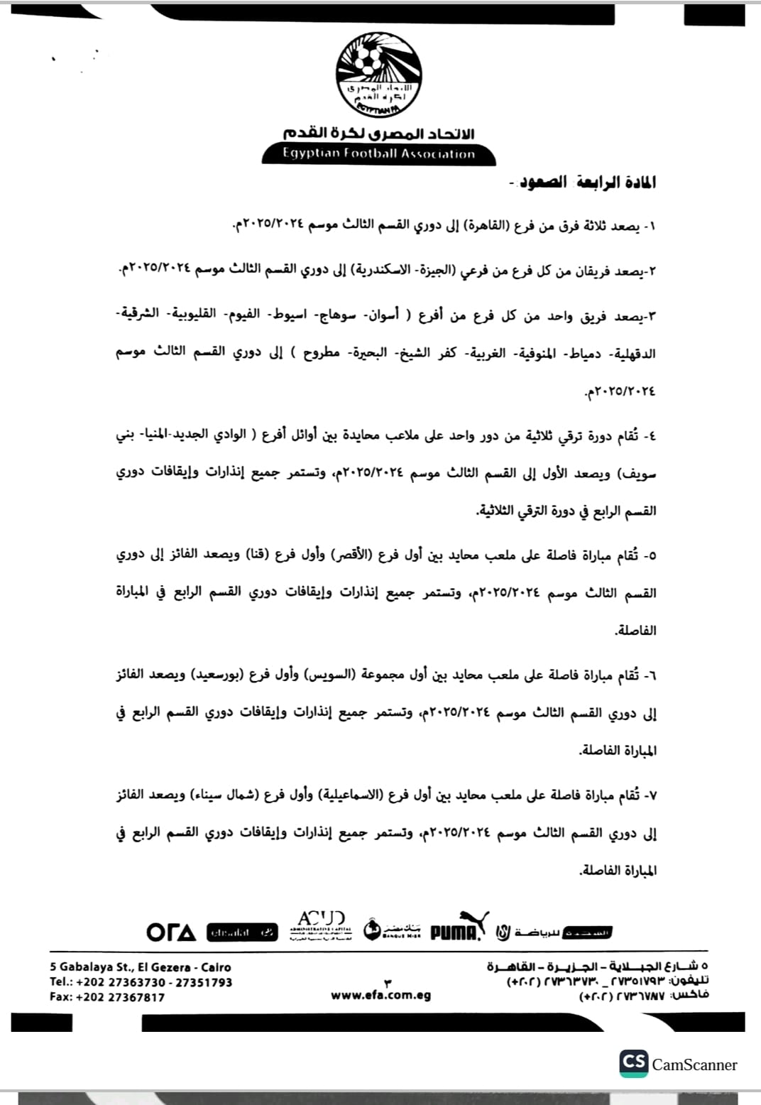 يصعد فريق واحد من من كل فرع “ أسوان وسوهاج وأسيوط والفيوم والقليوبية والشرقية والدقهلية ودمياط والمنوفية والغربية وكفر الشيخ والبحيرة ومطروح ” إلي دوري القسم الثالث 2024-2025
