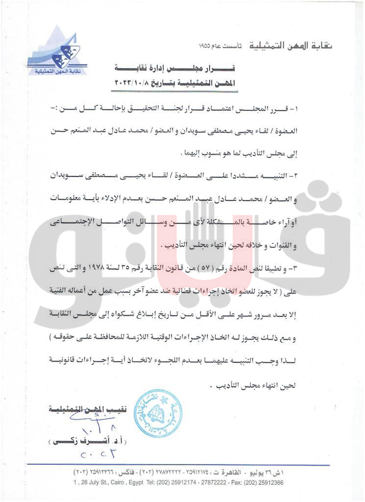 وجاء بيان النقابة كالآتي: قرر المجلس اعتماد قرار لجنة التحقيق بإحالة كل من لقاء يحيى مصطفى سويدان، ومحمد عادل عبد المنعم حسن، إلى مجلس التأديب لما هو منسوب إليهما.