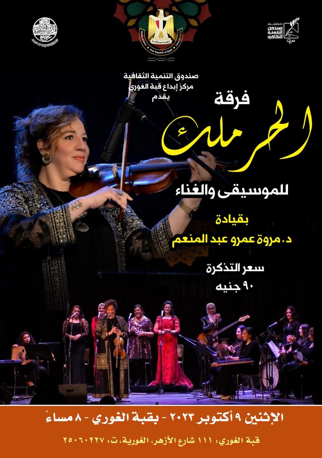 يقيم مركز إبداع قبة الغوري، والتابع لقطاع صندوق التنمية الثقافية في الثامنة مساء اليوم الإثنين الموافق ٩ أكتوبر الجاري، حفل لفرقة "الحرملك" بقيادة الدكتورة مروة عبد المنعم أستاذ مساعد آلة الفيولينه بكلية التربية النوعية بجامعة عين شمس.