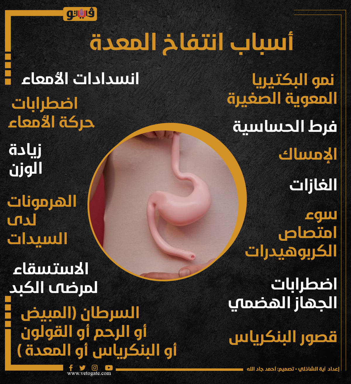 أسباب انتفاخ المعدة (انفوجراف) الثلاثاء 31/أكتوبر/2023 - 11:03 ص 10/31/2023 11:03:44 AM انتفاخ المعدة، فيتو آية الشاذلي شارك طباعة 18 حجم الخط شارك طباعة اضطرابات الجهاز الهضمي البكتيريا المعوية التهاب المعدة البنكرياس الإمساك الاستسقاء الجهاز الهضمي الهرمونات تجويف البطن سرطان المبيض فرط الحساسية مرض الكبد