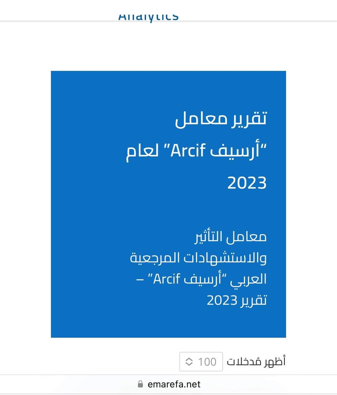 فقد أطلق معامل التأثير والاستشهادات المرجعية للمجلات العلمية العربية (ارسيف ARCIF) وهو احد مبادرات قاعدة "معرفة" نتائج تقريره السنوي لعام ٢٠٢٣ حول الإنتاج العلمي الاكاديمي العربي.