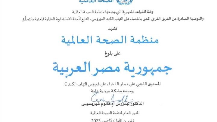 هنأت منظمة الصحة العالمية مصر على حصولها على «المستوى الذهبي» على مسار القضاء على التهاب الكبد C.