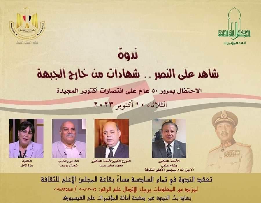 يقيم المجلس الأعلى للثقافة ندوة بعنوان "شاهد على النصر.. شهادات من خارج الجبهة" والتي ينظمها المجلس ضمن سلسلة من الفعاليات الثقافية على امتداد شهر أكتوبر احتفالًا بمرور 50 عامًا على انتصارات أكتوبر المجيدة.
