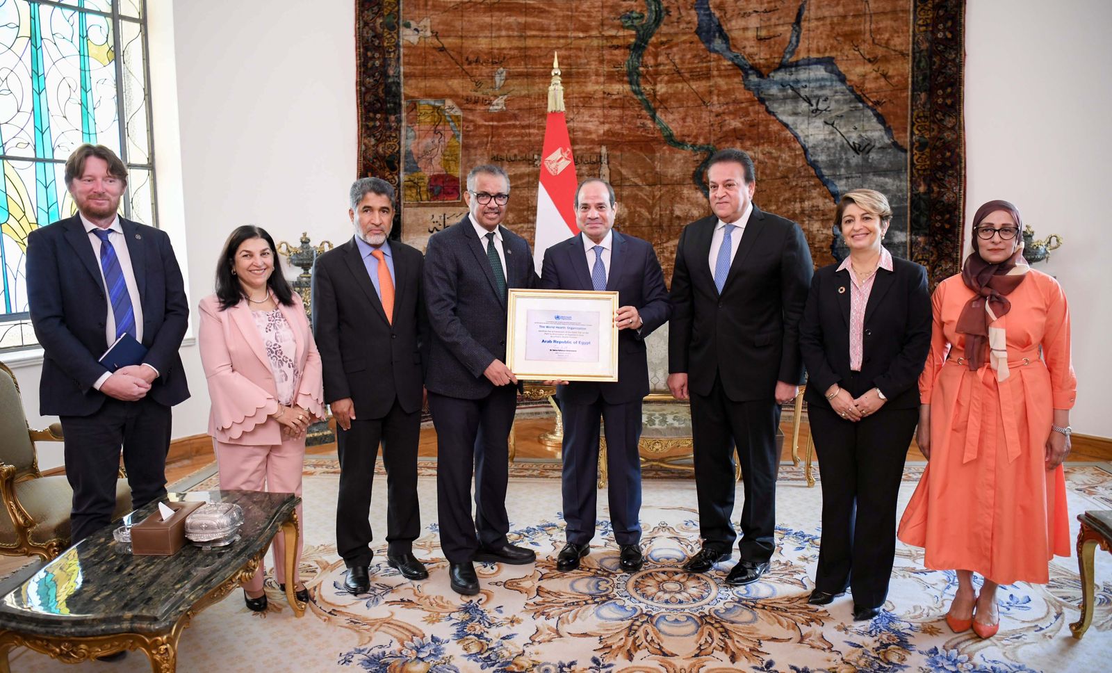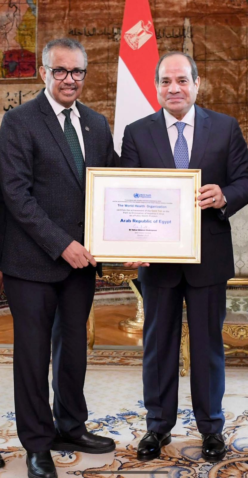 وصرح المستشار أحمد فهمي المتحدث الرسمي باسم رئاسة الجمهورية أن مدير عام منظمة الصحة العالمية سلّم الرئيس شهادة المستوى الذهبي على مسار القضاء على فيروس "سي" في مصر، مقدمًا التهنئة لمصر وموضحًا أنها أصبحت الدولة الأولى في العالم التي تحصل على هذا الإشهاد، بعد تحقيقها، في زمن قياسي، قصة نجاح عالمية يحتذى بها، في التحول من كونها أعلى الدول من حيث ارتفاع معدلات الإصابة بفيروس "سي" إلى أول دولة في العالم تصل لهذا المستوى المتميز في القضاء على الفيروس.