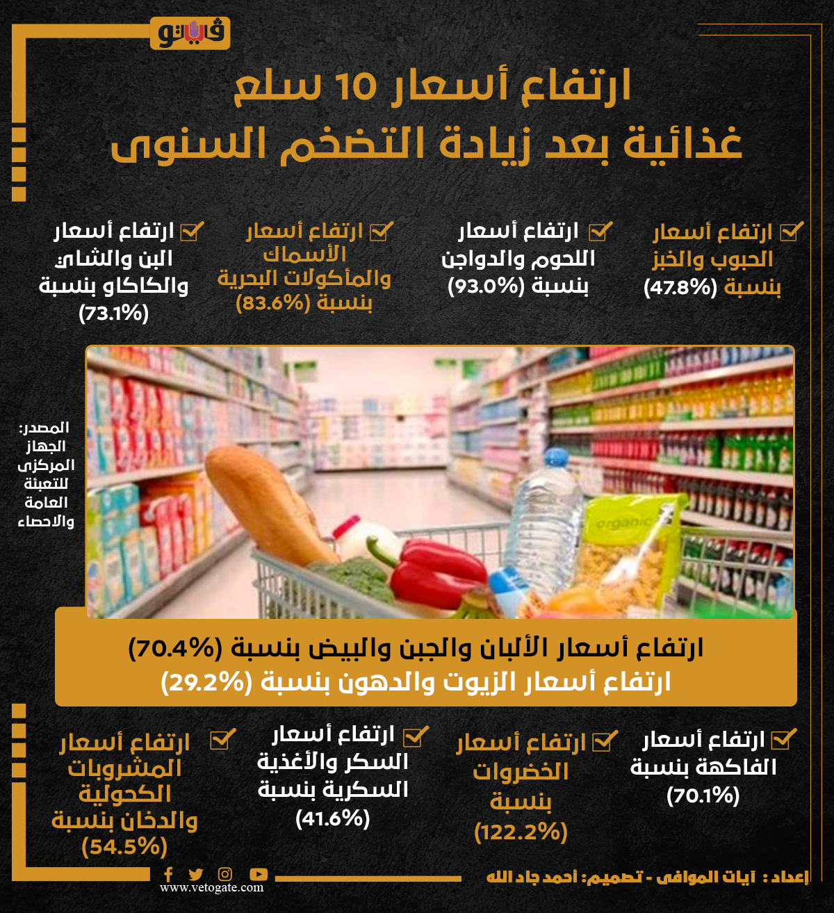 ارتفاع أسعار 10 سلع غذائية بعد زيادة التضخم السنوى (إنفوجراف) الثلاثاء 10/أكتوبر/2023 - 11:34 ص 10/10/2023 11:34:40 AM صورة ارشيفية، فيتو آيات الموافى شارك طباعة 18 حجم الخط شارك طباعة التضخم السنوى التضخم زيادة التضخم السنوى
