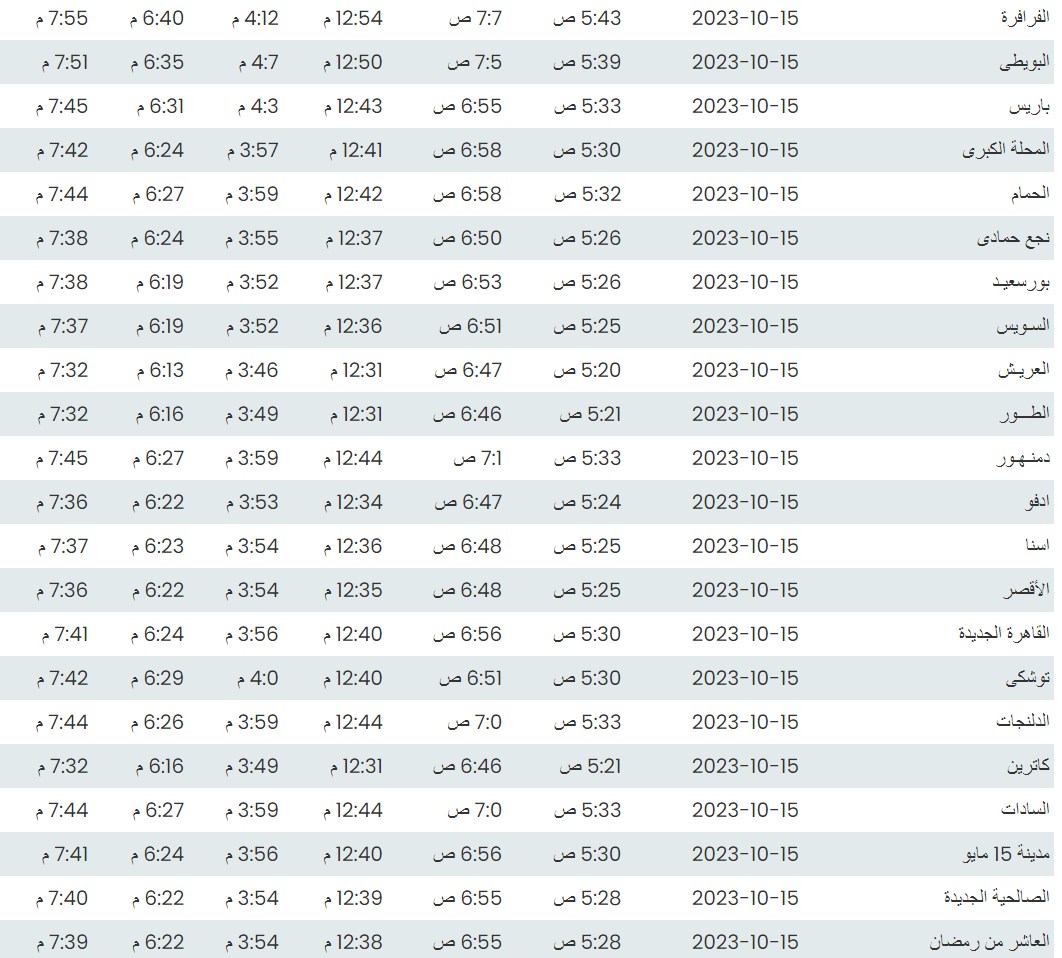 مواقيت الصلاة اليوم وفقًا للتوقيت المحلي لمدينتي القاهرة والإسكندرية وكذلك، مواقيت الصلاة، لعدد من مدن ومحافظات الجمهورية من واقع بيانات الهيئة العامة للمساحة