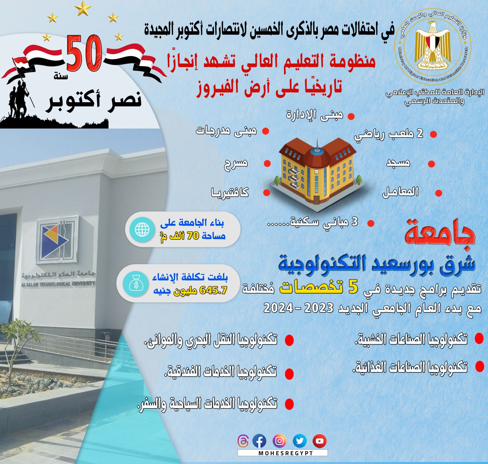 ومن جانبه، أشار الدكتور مدحت عوض رئيس جامعة شرق بورسعيد التكنولوجية إلى أنه تم إنشاء جامعة شرق بورسعيد التكنولوجية بتكلفة بلغت 645.7 مليون جنيه، على مساحة 70.140 مترًا مربعًا، موضحًا أن الجامعة تضم برامج جديدة، تخدم الصناعة بالمنطقة الجغرافية "شرق بورسعيد وشمال سيناء"، منها: (تكنولوجيا الصناعات الخشبية، تكنولوجيا الصناعات الغذائية، تكنولوجيا النقل البحري والموانئ، تكنولوجيا الخدمات الفندقية، تكنولوجيا الخدمات السياحية والسفر).