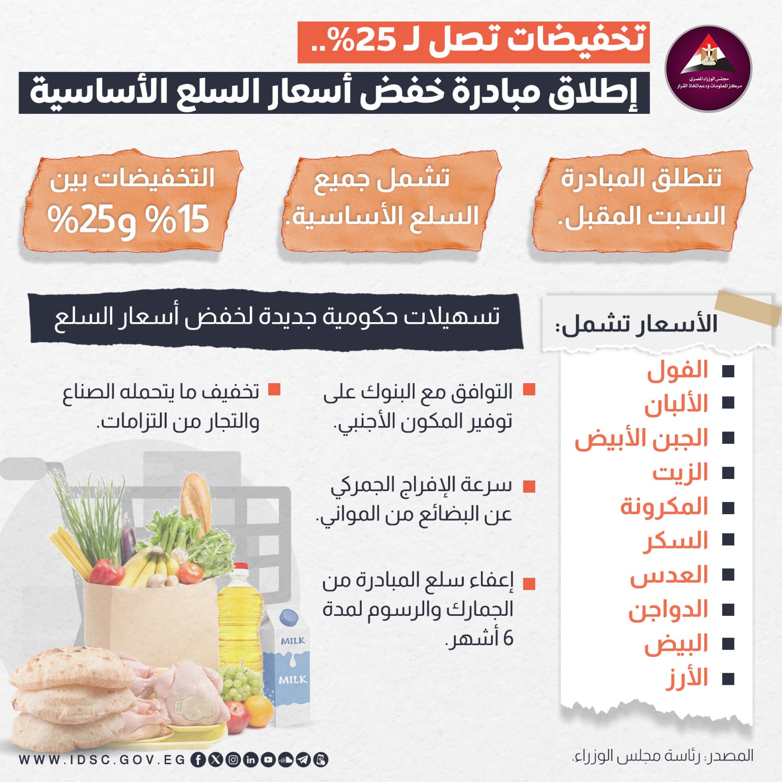 نشرت الصفحة الرسمية لمركز المعلومات ودعم اتخاذ القرار بمجلس الوزراء على موقع التواصل الاجتماعي فيسبوك انفوجراف جديدا تحت عنوان (تخفيضات تصل لـ25%، إطلاق مبادرة خفض أسعار السلع الأساسية).
