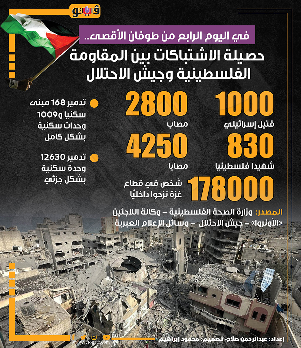 في اليوم الرابع من طوفان الأقصى.. حصيلة الاشتباكات بين المقاومة الفلسطينية وجيش الاحتلال (إنفوجراف) الثلاثاء 10/أكتوبر/2023 - 07:16 م 10/10/2023 7:16:34 PM طوفان الأقصى، فيتو عبدالرحمن صلاح شارك طباعة 18 حجم الخط شارك طباعة طوفان الأقصى عملية طوفان الأقصى جيش الاحتلال الاحتلال الإسرائيلي المقاومة الفلسطينية قطاع غزة