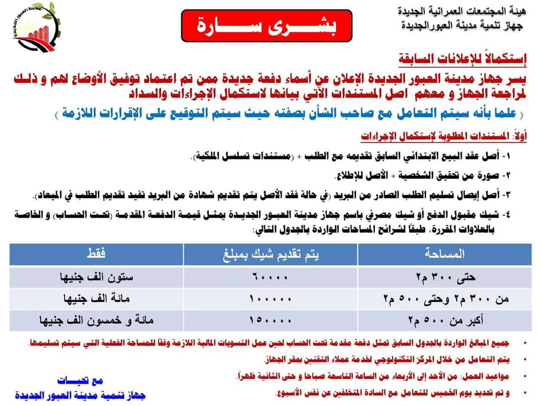 - شيك مقبول الدفع أو شيك مصرفي باسم جهاز مدينة العبور الجديدة يمثل قيمة الدفعة المقدمة تحت الحساب والخاصة بالعلاوات المقررة.