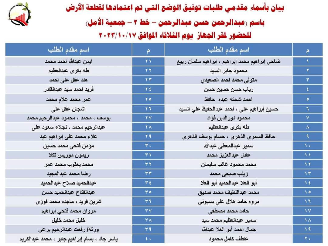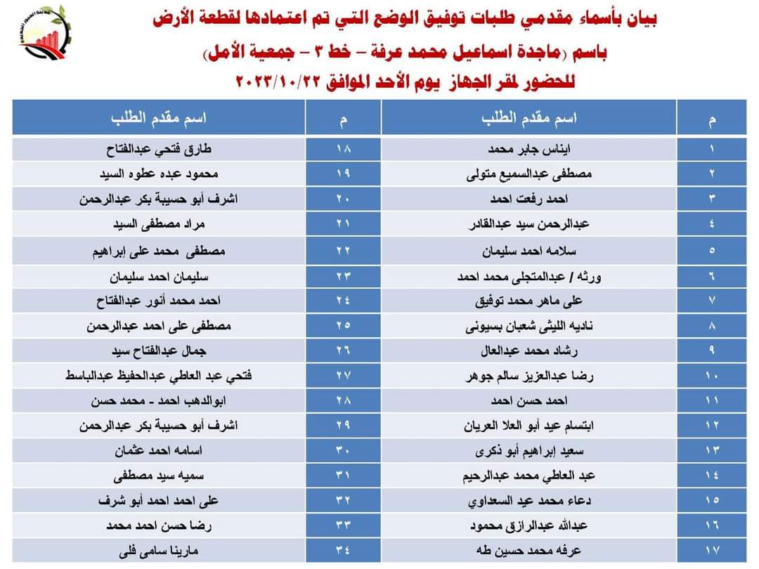 أعلن جهاز مدينة العبور الجديدة عن أسماء دفعة جديدة من المواطنين الذين تم اعتماد توفيق الأوضاع لأراضيهم التابعة للمدينة.