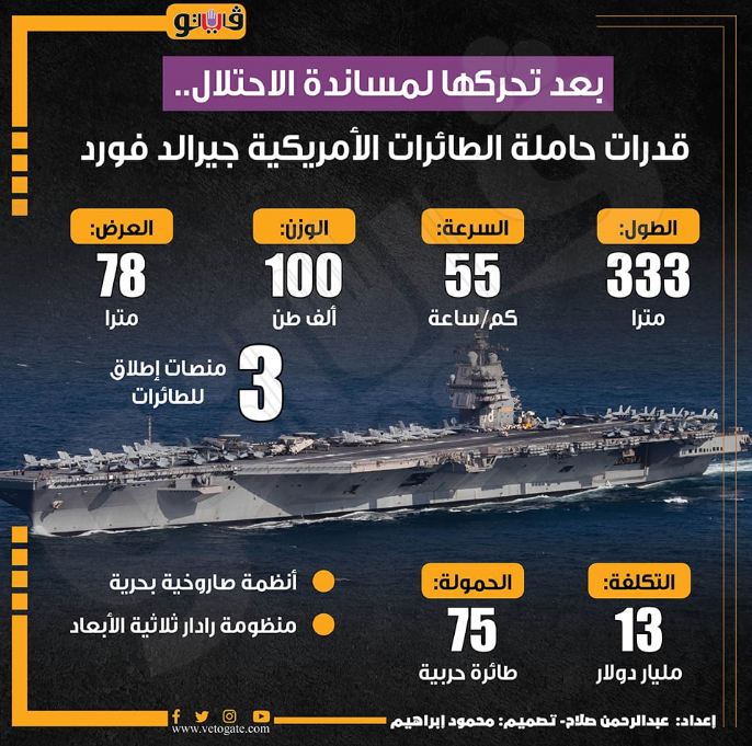 وكان وزير الدفاع الأمريكي، لويد أوستن، أعلن في مؤتمر صحفي عقده، أنه وجه بتحريك حاملة الطائرات الهجومية جيرالد فورد إلى شرق البحر المتوسط بالتزامن مع استعداد واشنطن لتقديم مساعدات لإسرائيل.