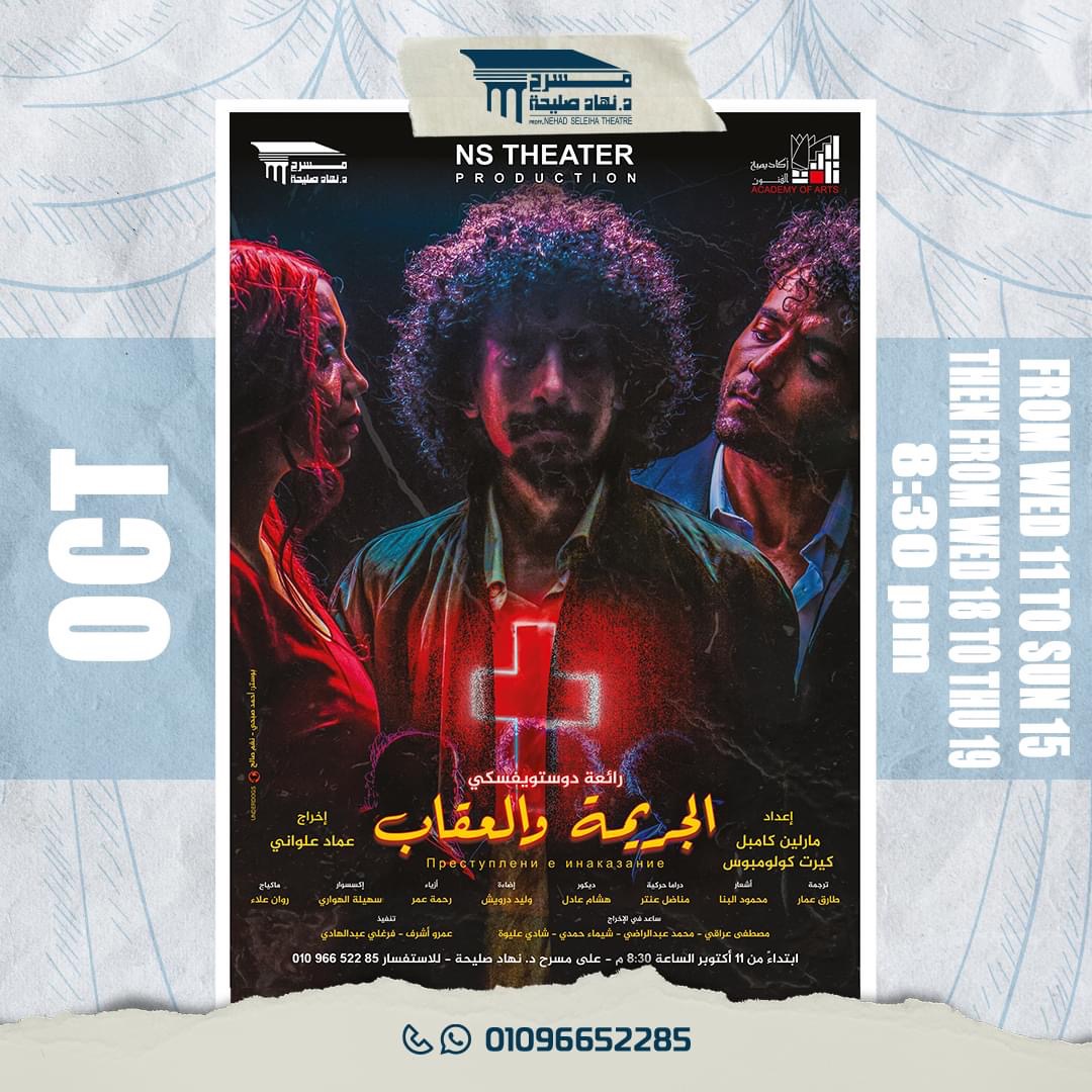 تنطلق مساء اليوم الأربعاء الموافق ١١ أكتوبر الجاري، أولى ليالي عرض "الجريمة والعقاب" على خشبة مسرح نهاد صليحة بأكاديمية الفنون بالهرم، وذلك في تمام الثامنة والنصف مساء، حيث تعد المسرحية أولى إنتاجات مسرح نهاد صليحة.