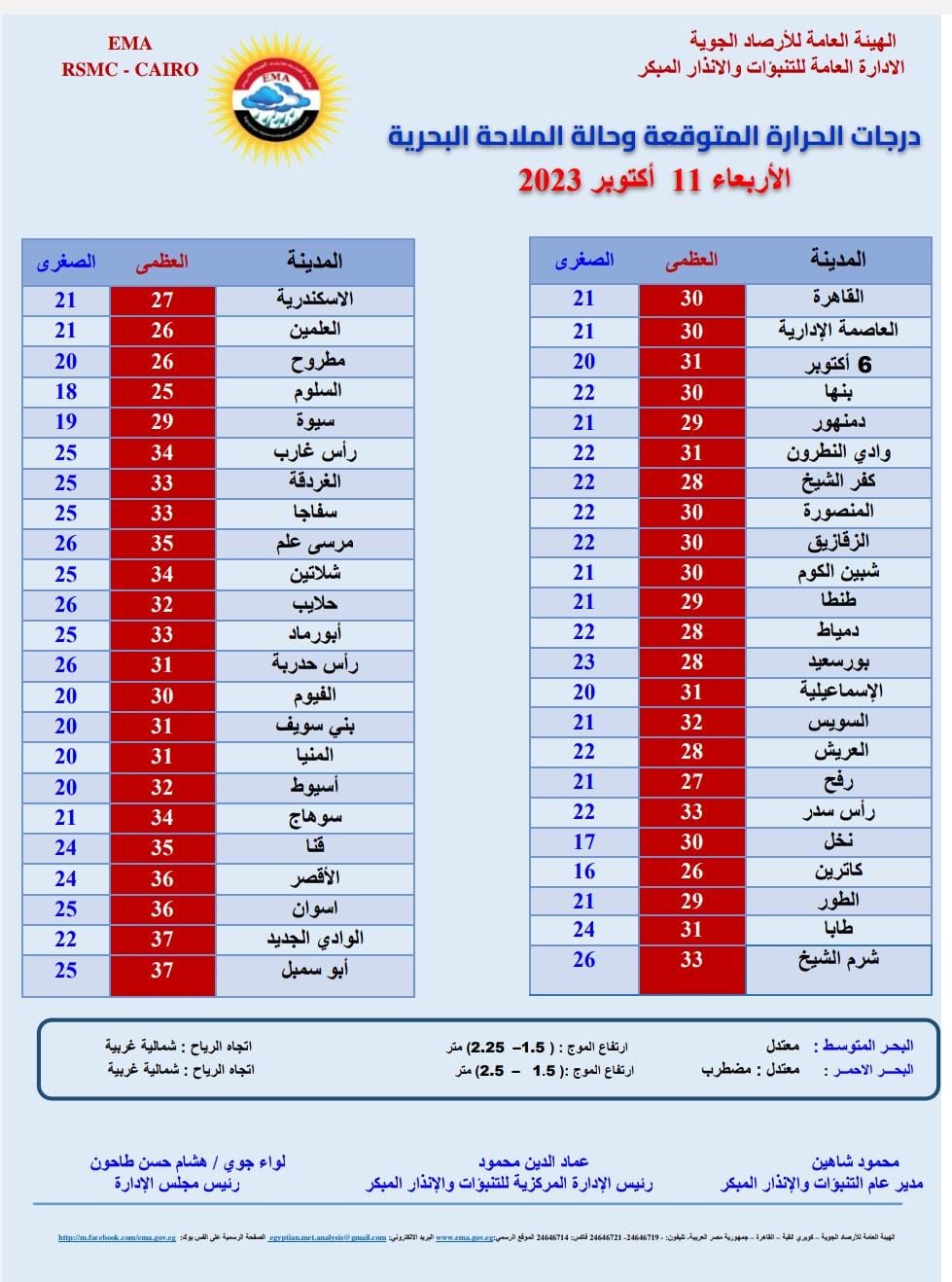 كما نشرت هيئة الأرصاد الجوية بيانا بدرجات الحرارة المتوقعة اليوم على مدن ومحافظات مصر والتي جاءت كالتالي:
