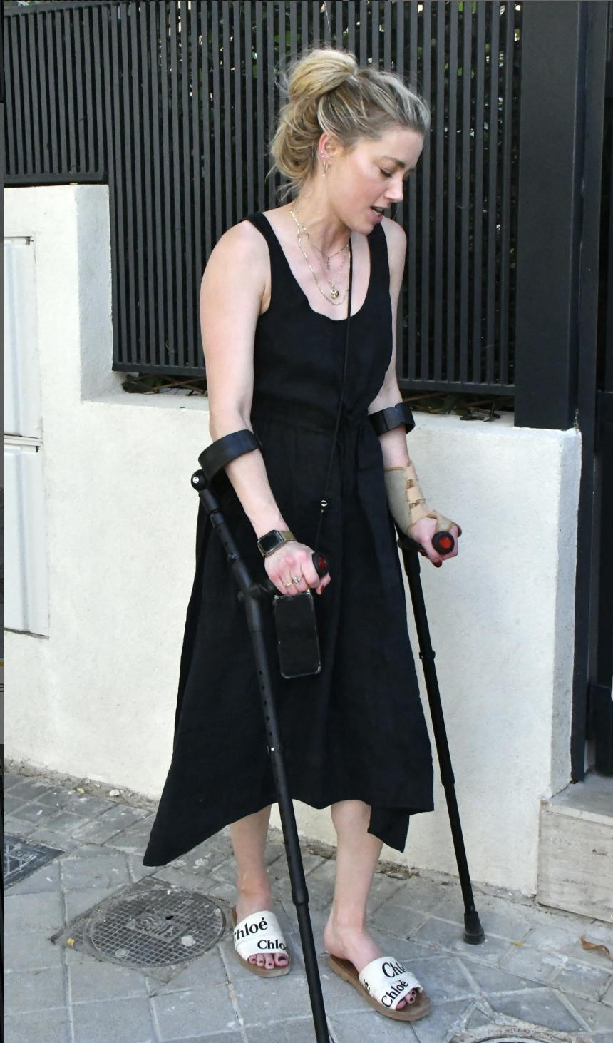 التقطت عدسات المصورين صور للممثلة آمبر هيرد، طليقة جوني ديب، وهي تعرج، وتمشي بعكازين في العاصمة الإسبانية مدريد.