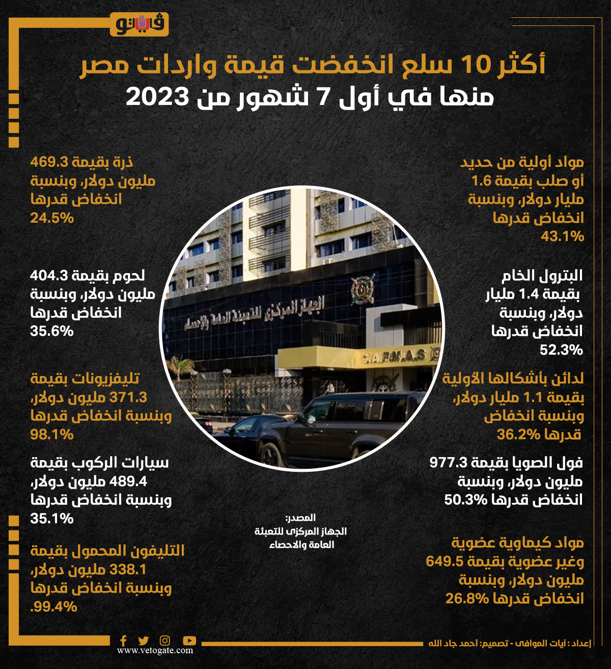 أكثر 10 سلع انخفضت قيمة واردات مصر منها في أول 7 شهور من 2023 (انفوجراف) الأربعاء 11/أكتوبر/2023 - 01:02 م 10/11/2023 1:02:37 PM صورة ارشيفية آيات الموافى شارك طباعة 18 حجم الخط شارك طباعة مواد أولية من حديد أو صلب البترول الخام لدائن بأشكالها الأولية