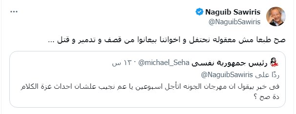 وذلك ردًا على أحد متابعيه الذي سأله قائلًا: "فى خبر بيقول إن مهرجان الجونة اتأجل أسبوعين يا عم نجيب علشان أحداث غزة الكلام دة صح؟"