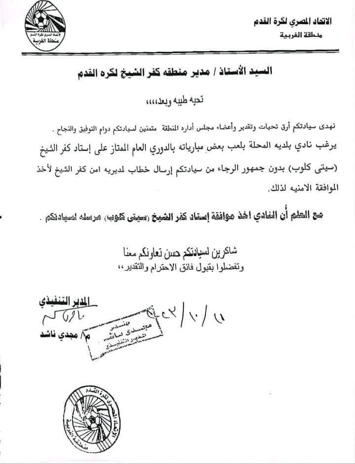 وجاء في خطاب بلدية المحلة أنه يرغب في موافقة مديرية أمن كفر الشيخ بنقل مباريات الفريق لنادي سيتي كلوب بدون حضور جماهيري.