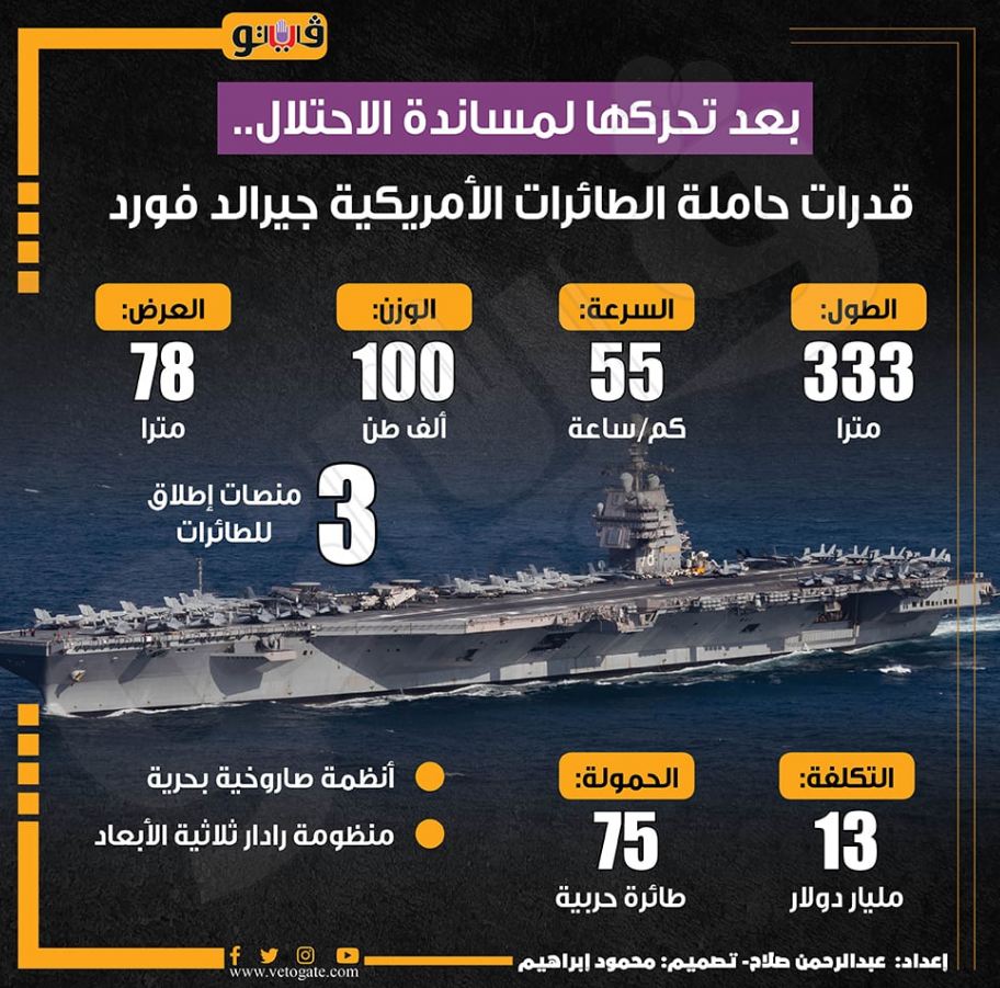 وشدد حزب الله، على أنّ "إرسال حاملات الطائرات جيرالد فورد، إلى المنطقة بهدف رفع معنويات العدو وجنوده المحبطين تكشف عن ضعف الآلة العسكرية الصهيونية رغم ما ترتكبه من جرائم ومجازر، وبالتالي حاجتها إلى الدعم الخارجي المتواصل لمد هذا الكيان الغاصب المؤقت بأسباب الحياة، ولذلك نؤكد أن هذه الخطوة لن تخيف شعوب أمتنا ولا فصائل المقاومة مستعدة للمواجهة حتى تحقيق النصر النهائي والتحرير الكامل".