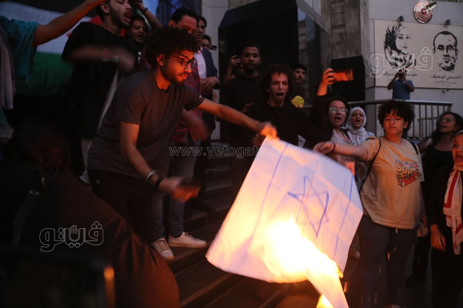 حرق مجموعة من الصحفيين المشاركين في اليوم التضامني مع الشعب الفلسطيني، صور جون بايدن، الرئيس الأمريكي، وعلم الولايات المتحدة الأمريكية، احتجاجًا على تصريحاته أمس الثلاثاء الداعمة ماديًا ومعنويًا، للهجمات الوحشية التي تشنها قوات الاحتلال على قطاع غزة وحالة الحصار المفروضة عليه.