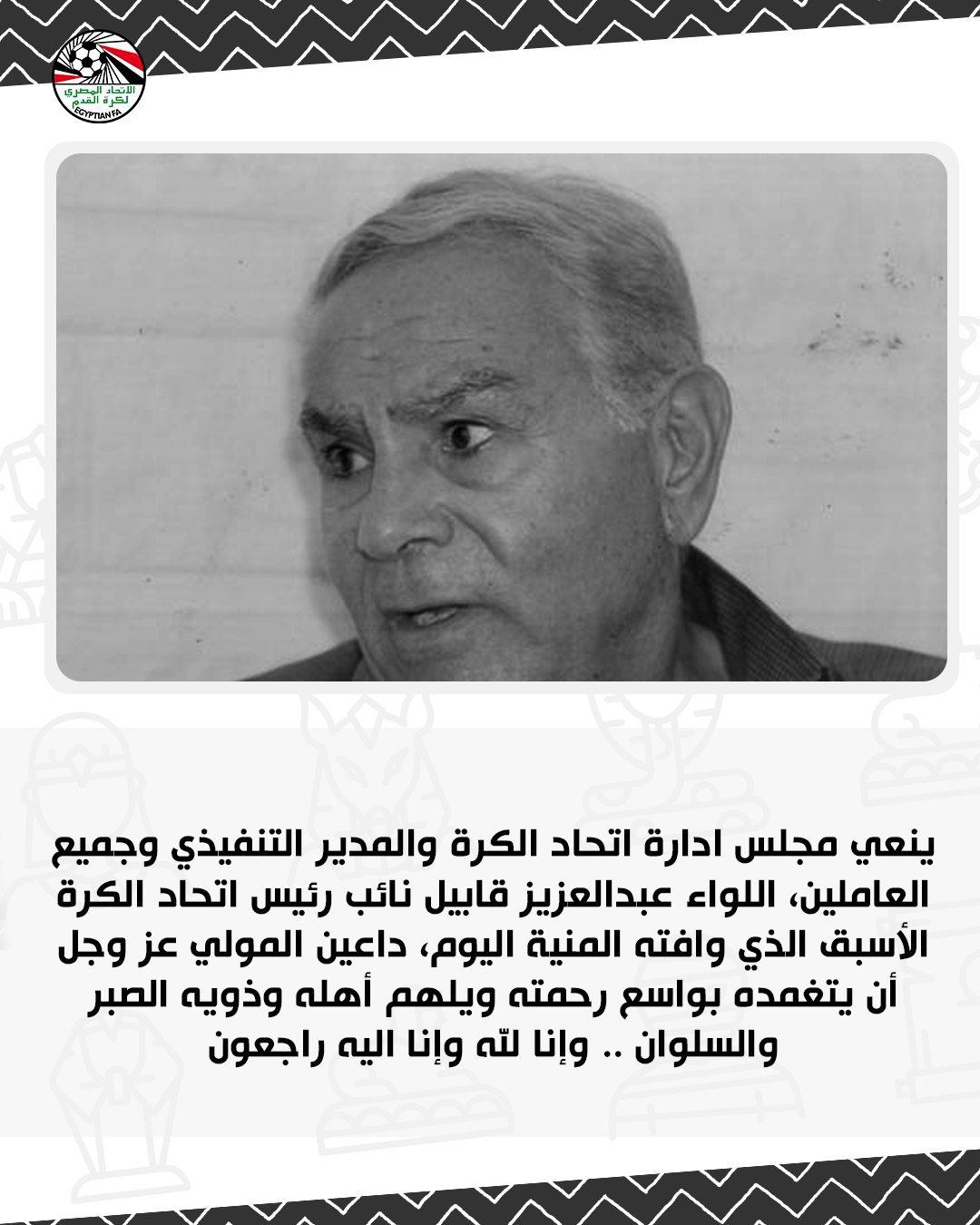 اتحاد الكرة، نعى مجلس إدارة اتحاد الكرة والمدير التنفيذي وجميع العاملين، اللواء عبدالعزيز قابيل نائب رئيس اتحاد الكرة الأسبق الذي وافته المنية اليوم.