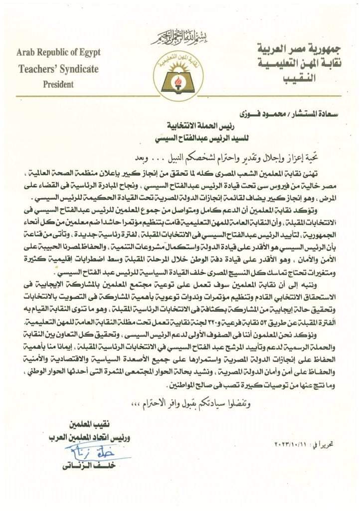 حملة السيسي الانتخابية تتلقى خطاب تأييد من نقابة المعلمين