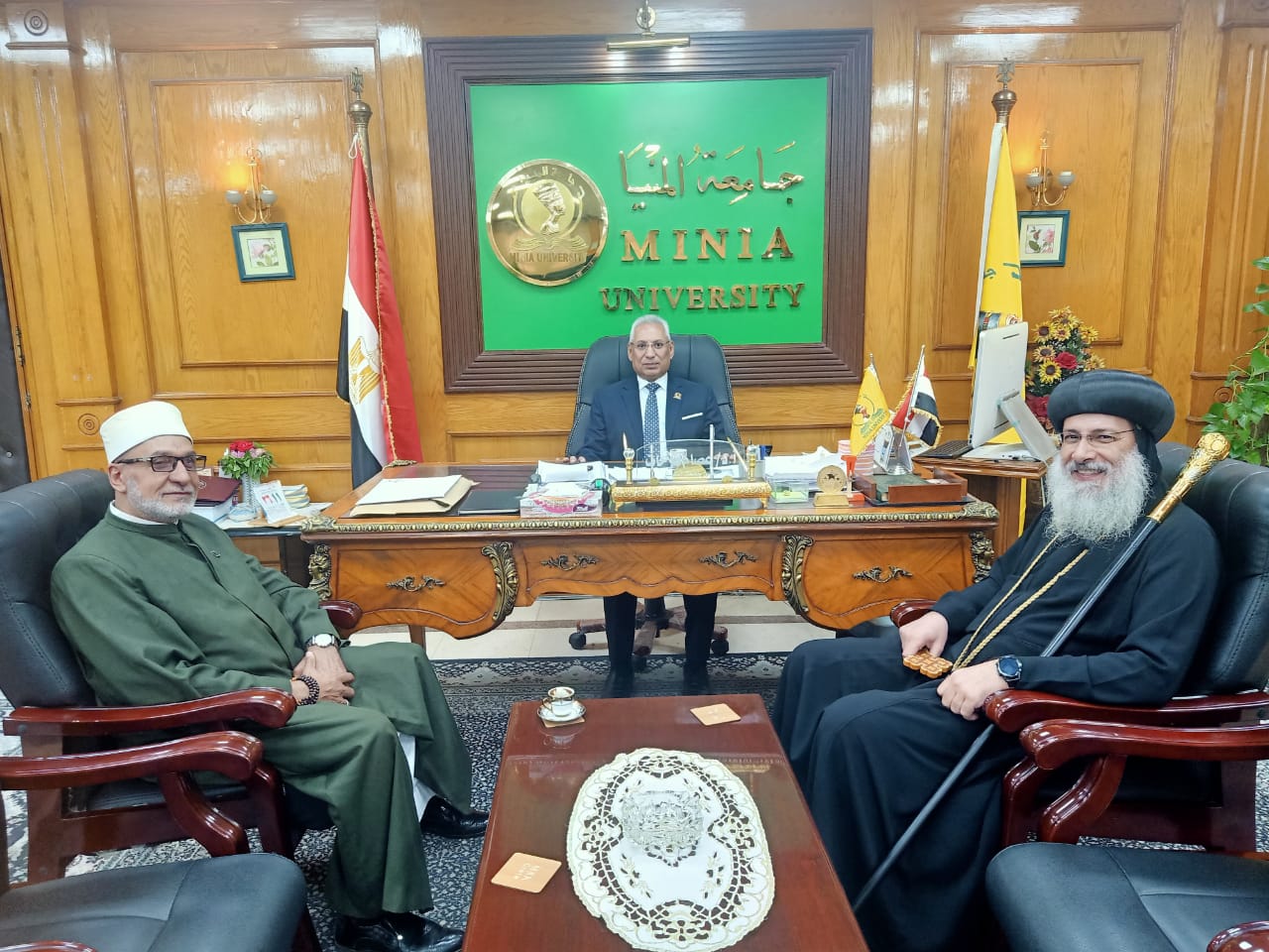 رئيس جامعة المنيا يستقبل أسقف إيبارشة شرق ورئيس المنطقة الأزهرية (صور)