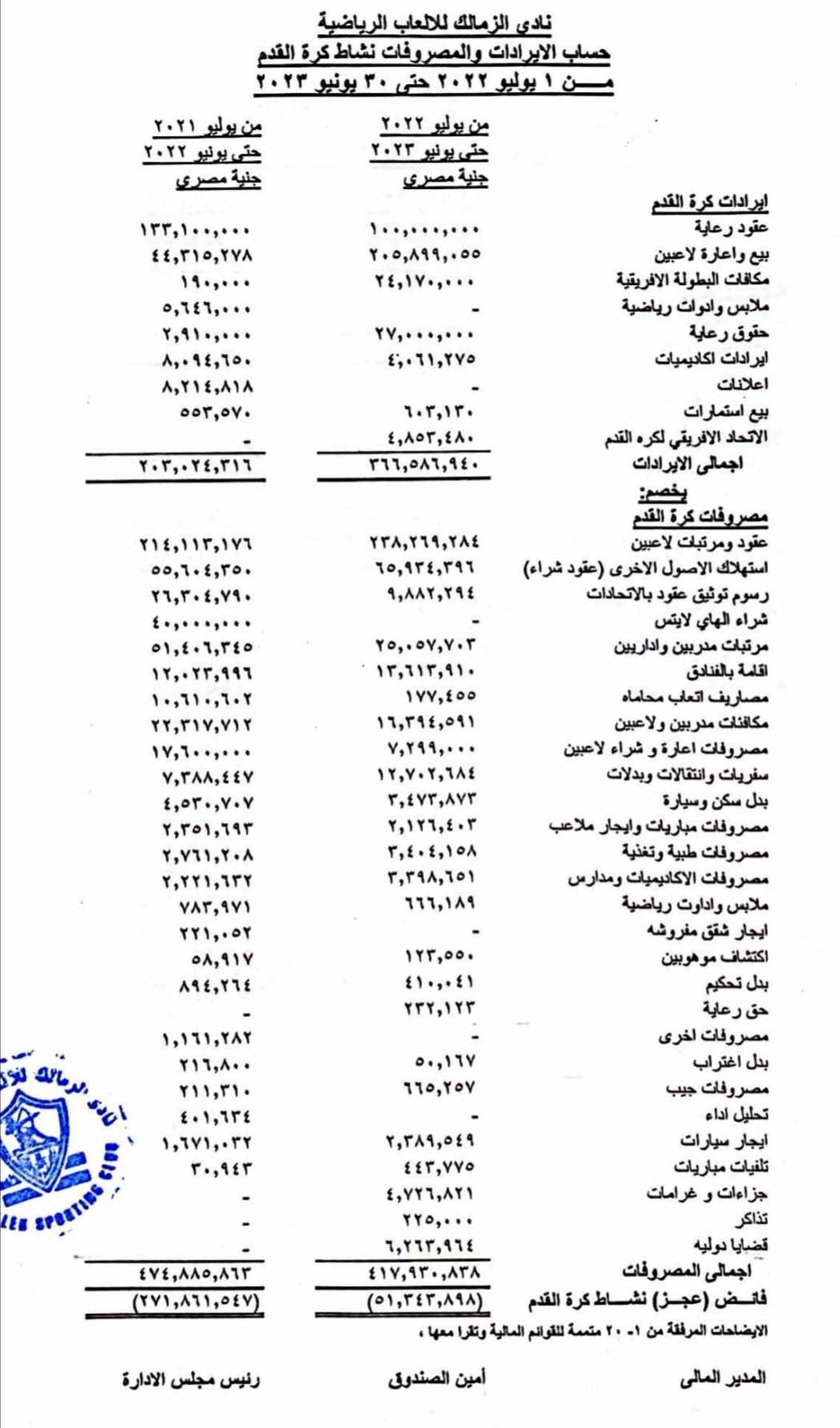 نشر نادي الزمالك الميزانية المالية للنادي من 1-7-2022 حتى 30-6-2023.