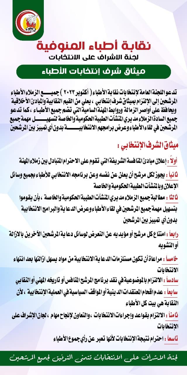 نشرت نقابة الأطباء في محافظة المنوفية عبر صفحتها الرسمية على موقع التواصل الاجتماعي فيس بوك ميثاق شرف للانتخابات وذلك قبل انطلاقها في التاسعة من صباح اليوم الجمعة بمقر النقابة بمدينة شبين الكوم، وتضمن الميثاق بنودًا تحث على التنافس بشرف واحترام النتيجة.