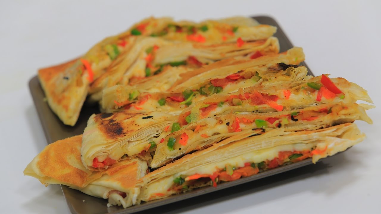 حين نصل لنصف كمية الجلاش نضع الحشو من الفلفل الرومى والطماطم والزيتون والجبنة، والبسطرمة أو السويس ونفردهم جيدا.