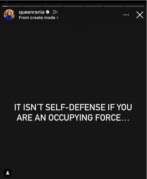 وكتبت “رانيا العبد الله” قائلة عبر ستوري الموقع قائلة: "لا يمكن اعتباره دفاعًا عن النفس إذا كنت قوة محتلة"، في إشارة إلى الهجوم الإسرائيلي البربري ضد سكان غزة، وتحجج تل أبيب بأنها جاءت "دفاعًا عن النفس"، على خلفية تنفيذ كتائب القسام هجومًا واسعًا ضد مستوطنات الغلاف.