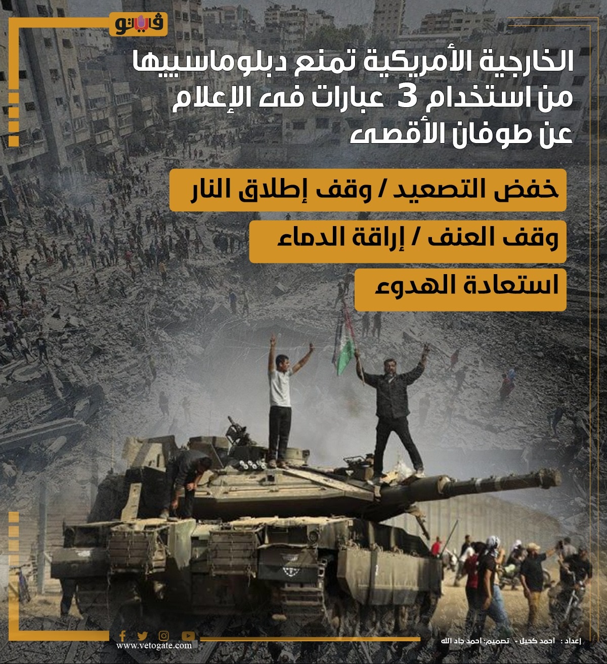 الخارجية الأمريكية تمنع دبلوماسييها من استخدام 3 عبارات في الإعلام عن طوفان الأقصى (إنفوجراف) السبت 14/أكتوبر/2023 - 12:01 م 10/14/2023 12:01:31 PM طوفان الأقصى، فيتو أحمد كحيل شارك طباعة 18 حجم الخط شارك طباعة طوفان الأقصى الاحتلال غزة اطلاق النار وقف العنف إستعادة الهدوء