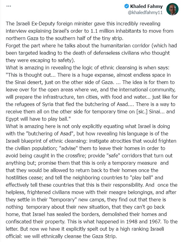 وقال الدكتور خالد فهمي عن المخطط الإسرائيلي لتهجير الفلسطينيين لسيناء إن "نائب وزير الخارجية الإسرائيلي السابق ديان أيلون أجرى هذه المقابلة الكاشفة بشكل لا يصدق، حيث شرح الأمر الذي أصدرته إسرائيل لـ 1.1 مليون نسمة بالانتقال من شمال غزة إلى النصف الجنوبي من القطاع الصغير."