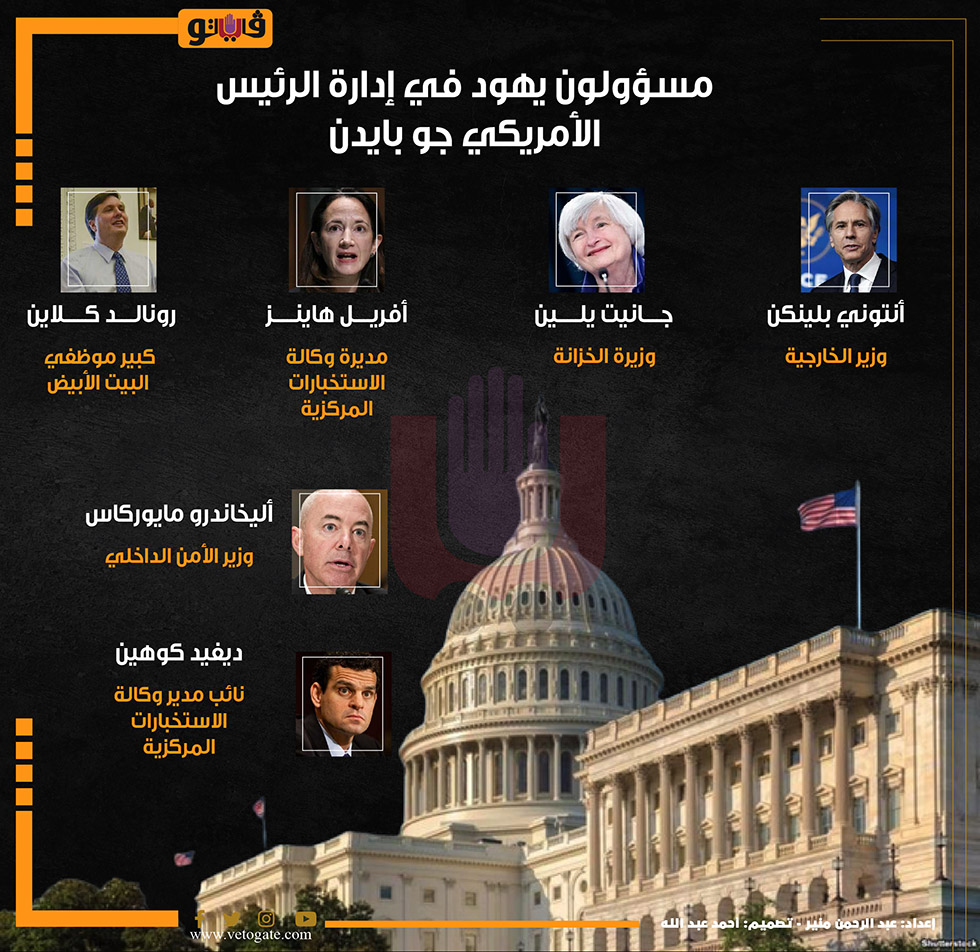 مسؤولون يهود في إدارة الرئيس الأمريكي جو بايدن (إنفوجراف) السبت 14/أكتوبر/2023 - 07:50 م 10/14/2023 7:50:05 PM وزير الخارجية الأمريكي، فيتو عبدالرحمن منير شارك طباعة 18 حجم الخط شارك طباعة إدارة بايدن المخابرات الأمريكية وزارة الخزانة اليهود