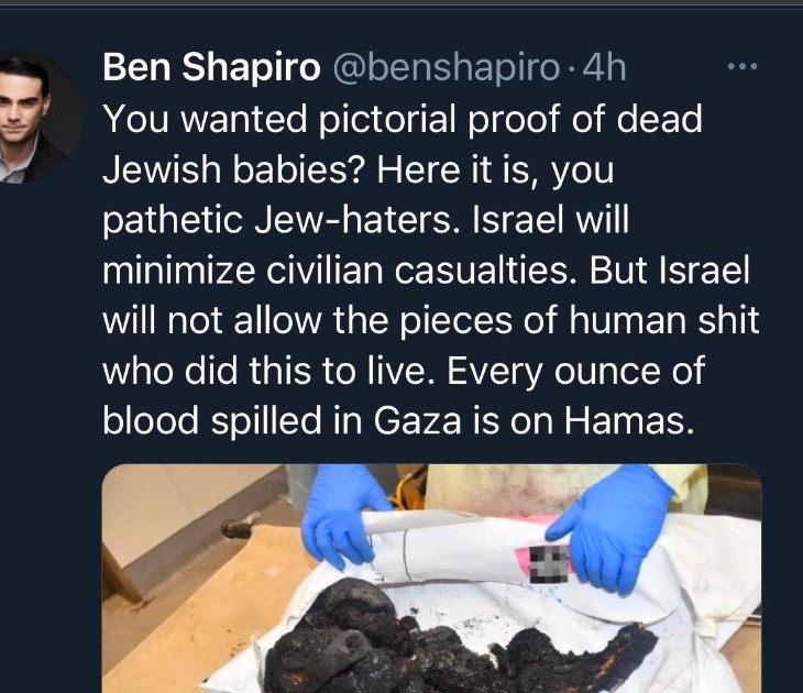 ومن هنا بدأ جاكسون هينكل في الكشف عن أكاذيب بن شابيرو، ورد قائلًا:"القرف المقدس الصورة التي حاول بن شابيرو تمريرها على أنها "جثة طفل محروقة" كانت صورة مزيفة تم إنشاؤها بواسطة الذكاء الاصطناعي!"
