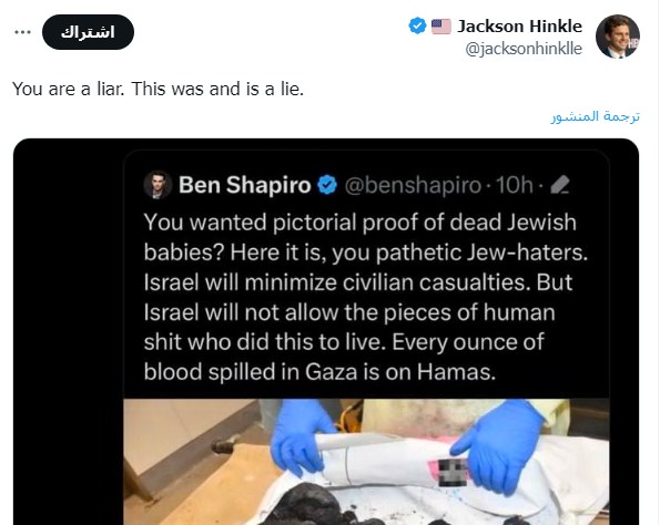 وعن كذب الإعلام الإسرائيلي قال الممثل الأمريكي جاكسون هينكل أن بن شابيرو قدم صورة مزيفة لما زعم أنه جثة متفحمة لأحد الأطفال اليهود، التي احترقت على يد المقاومة الفلسطينية، ليؤكد هينكل أن صورة بن شابيرو أنشأها بالذكاء الاصطناعي وليست صورة حقيقية.