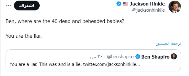 تكذيب الممثل والملحن الأمريكي جاكسون هينكل للإعلامي الإسرائيلي بن شابيرو، دفعت الأخير لمهاجمة هينكل زاعما كذب ما أكده هينكل، الأمر الذي دفع هينكل للرد متسائلًا عن أدلة ما تم إدعاءه من قبل وسائل الإعلام الإسرائيلية بأن المقاومة قتلت أربعين طفلًا يهوديًا، الأمر الذي لم يجد معه بن شابيرو أي مجال للدفع بمرزيد من الأكاذيب.